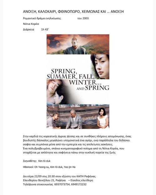 Θα παρακολουθήσουμε το ανυπέρβλητο κινηματογραφικό ποίημα από τη Νότια Κορέα ΑΝΟΙΞΗ, ΚΑΛΟΚΑΙΡΙ, ΦΘΙΝΟΠΩΡΟ, ΧΕΙΜΩΝΑΣ ΚΑΙ … ΑΝΟΙΞΗ, μια λυρική ταινία με βαθύ φιλοσοφικό υπόβαθρο, επικεντρωμένη στον τρόπο που η φύση αποδέχεται στωικά την αλλαγή των εποχών. Όπως θα μπορούσε να κάνει και ο άνθρωπος, σεβόμενος τη νομοτέλεια της ζωής, κατά τη διαδρομή του στο δρόμο προς τη γνώση.