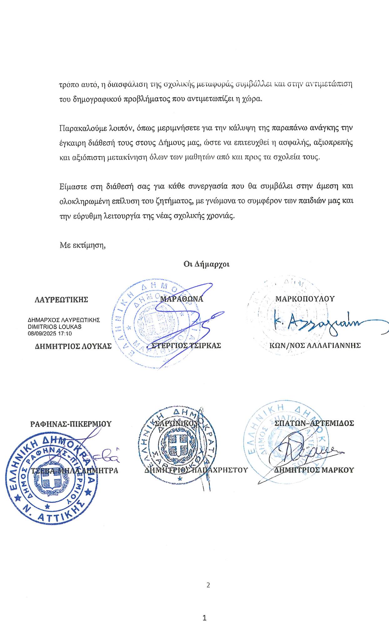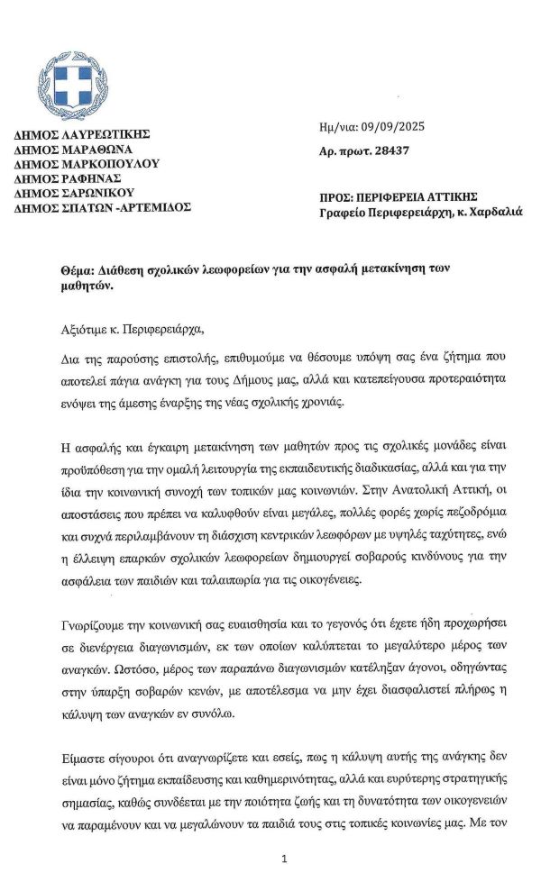 Δια της παρούσης επιστολής, επιθυμούμε να θέσουμε υπόψη σας ένα ζήτημα που αποτελεί πάγια ανάγκη για τους Δήμους μας, αλλά και κατεπείγουσα προτεραιότητα ενόψει της άμεσης έναρξης της νέας σχολικής χρονιάς.