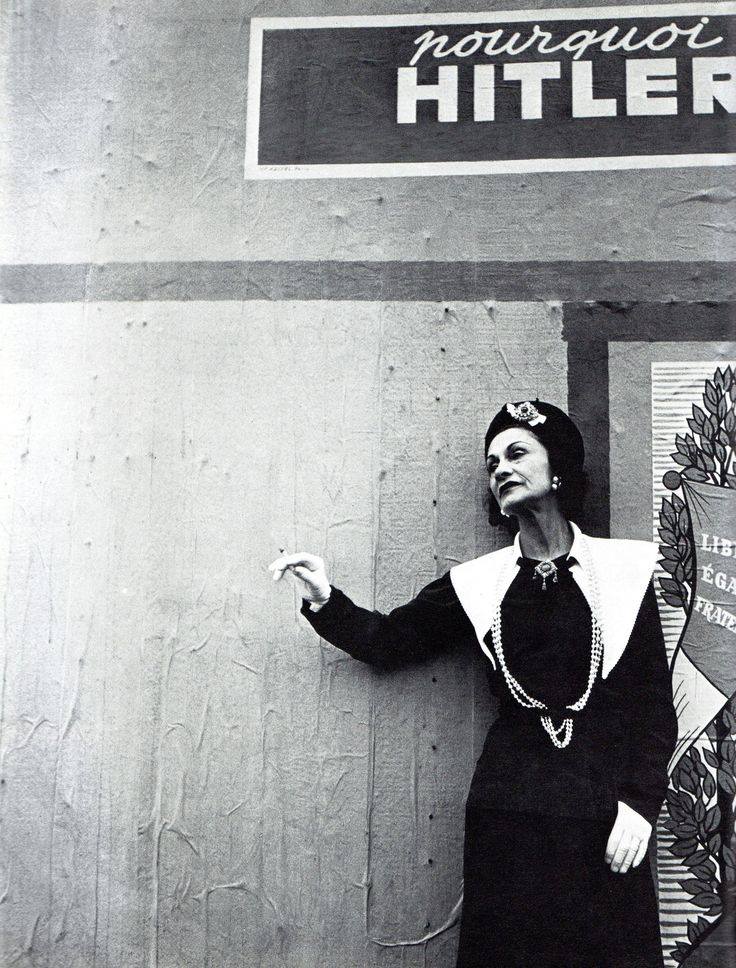 Aδημοσίευτο πορτρέτο της Κοκό Σανέλ από τον Ρίτσαρντ Άβεντον. Η Σανέλο στέκεται κάτω από μια πινακίδα που γράφει Pourquoi Hitler. Μη συνειδητοποιώντας πού είχε σταθεί, μόλις h Σανέλ είδε τη φωτογραφία, έξαλλη, απαγόρευσε στο περιοδικό Vogue να τη δημοσιεύσει. Πηγή: showstudio