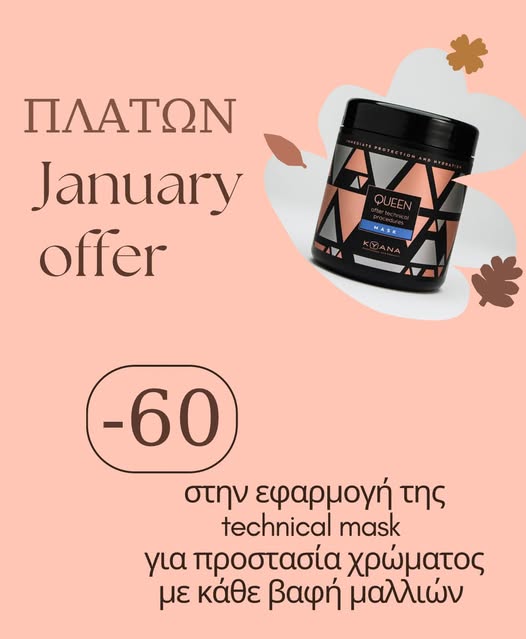 Από 20/1 έως 31/1, με κάθε υπηρεσία βαφής στο Κομμωτήριο ΠΛΑΤΩΝ, απολαμβάνεις -60% στην εφαρμογή της τεχνικής μάσκας QUEEN της KYANA, αποκλειστικά στο κομμωτήριο! ✂️✨