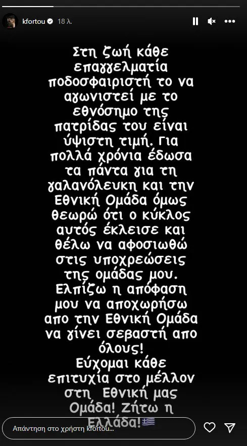 Με ένα στόρι στο ίνσταγκραμ ο Κώστας Φορτούνης ανακοίνωσε την απόφαση του να σταματήσει να αγωνίζεται με την Εθνική μας ομάδα. Ο Τρικαλινός μεσοεπιθετικός του Ολυμπιακού κατέγραψε με τη γαλανόλευκη φανέλα 54 συμμετοχές ενώ κατάφερε να σκοράρει και 9 γκολ.