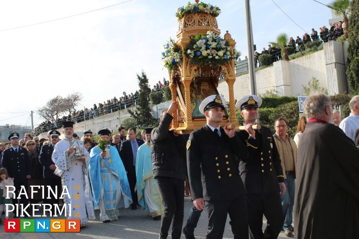 Ακολούθησε λιτανευτική πομπή του Ιερού Σταυρού προς το λιμάνι της Ραφήνας, όπου πραγματοποιήθηκε ο καθαγιασμός των υδάτων. Ο πατέρας Δημήτριος Μπακόπουλος έριξε τον Τίμιο Σταυρό στη θάλασσα, ενώ τολμηροί κολυμβητές βούτηξαν στα νερά για να τον ανασύρουν, τηρώντας το εορταστικό έθιμο.