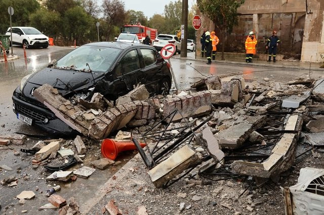 Από τα συντρίμμια προκλήθηκαν ζημιές σε σταθμευμένα αυτοκίνητα.
