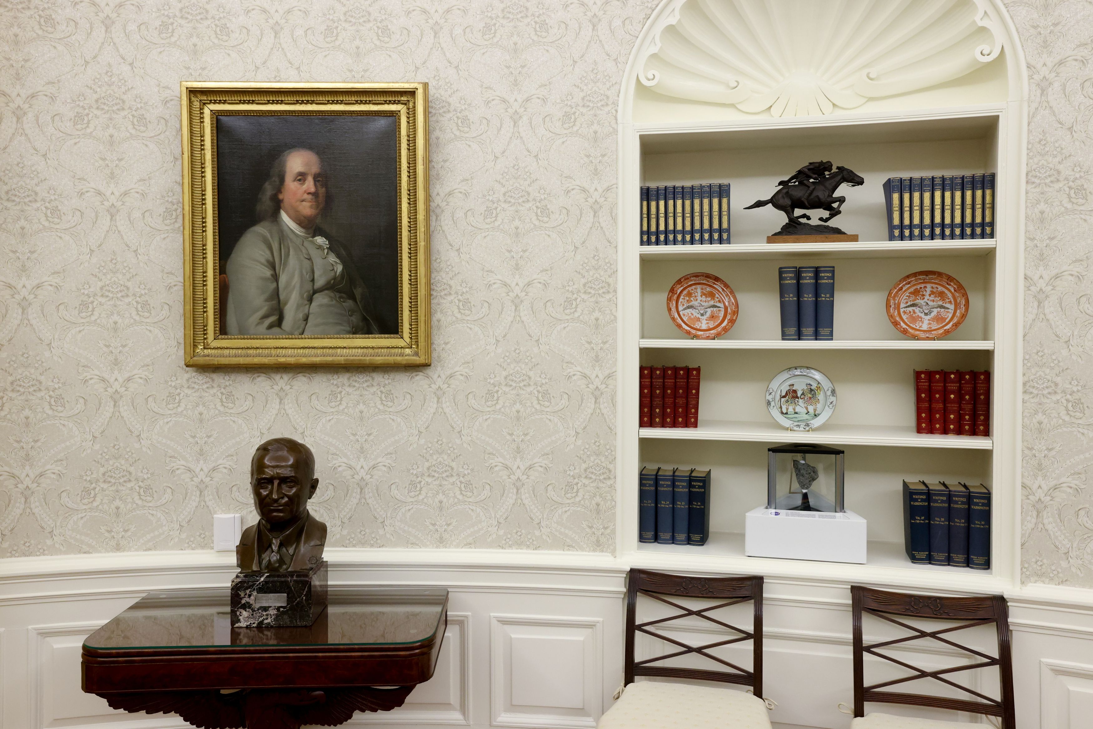 Το γραφείο είναι γεμάτο με φωτογραφίες της οικογένειας Τραμπ, ένα αντίγραφο της διακήρυξης της ανεξαρτησίας και δώρα από επισκέπτες και φιλόζωους – συμπεριλαμβανομένου του τροπαίου του Παγκοσμίου Κυπέλλου Συλλόγων της FIFA, το οποίο δόθηκε στον Τραμπ από τον πρόεδρο του οργανισμού.