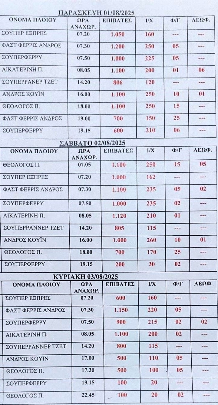 Με τον Αύγουστο να βρίσκεται στο ξεκίνημά του, το λιμάνι της Ραφήνας σφύζει από ζωή, φέρνοντας μαζί του τη γνωστή ελληνική καλοκαιρινή ενέργεια — αλλά και την ανάγκη για σωστή οργάνωση και υπομονή. Μετά τα αναλυτικά στοιχεία επιβατών και οχημάτων ανά πλοίο, που σας παραθέτουμε, αμέσως μετά, μπορείτε να παρακολουθήσετε ρεπορτάζ που κάναμε, με βίντεο, το πρωϊ του Σαββάτου 2/8.