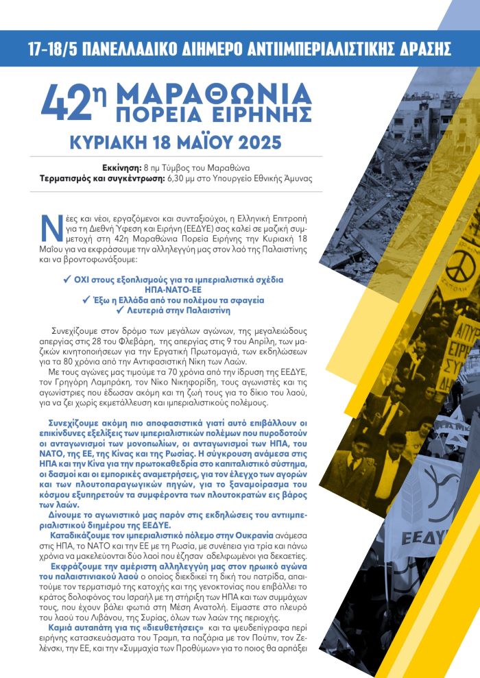 ΠΡΟΓΡΑΜΜΑ 42ης ΜΑΡΑΘΩΝΙΑΣ ΠΟΡΕΙΑΣ ΕΙΡΗΝΗΣ – 18/5/2025