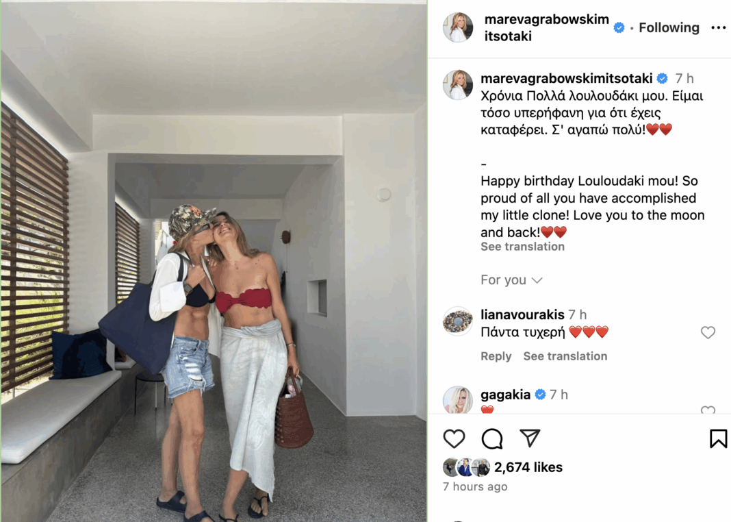 Η εικόνα αυτή, που αποτελεί μια σπάνια δημόσια εμφάνιση της πρώτης κυρίας με μαγιό, αναδεικνύει τη ζεστή σχέση μητέρας-κόρης και την οικογενειακή οικειότητα. Το μήνυμα που συνόδευε τη φωτογραφία ήταν γεμάτο αγάπη και ευχές για τα γενέθλια της Δάφνης, με τη Μαρέβα να αποτυπώνει την ιδιαίτερη αυτή στιγμή με απλότητα και τρυφερότητα.