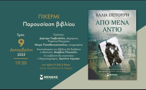 Μια εξαιρετική βραδιά λόγου και τέχνης έρχεται στο Πικέρμι τη Τρίτη 9 Δεκεμβρίου, στις 7.30 το βράδυ, με αφορμή την παρουσίαση του νέου βιβλίου της Βάλιας Πετούρη.