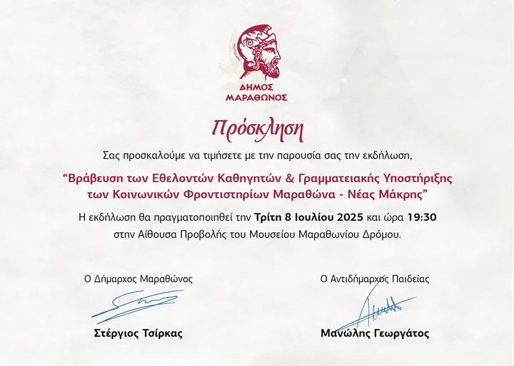 Σας προσκαλούμε να τιμήσετε με την παρουσία σας την εκδήλωση Βράβευσης εθελοντών Καθηγητών και Γραμματειακής Υποστήριξης των Κοινωνικών Φροντιστηρίων Mαραθώνα και Νέας Μάκρης.
