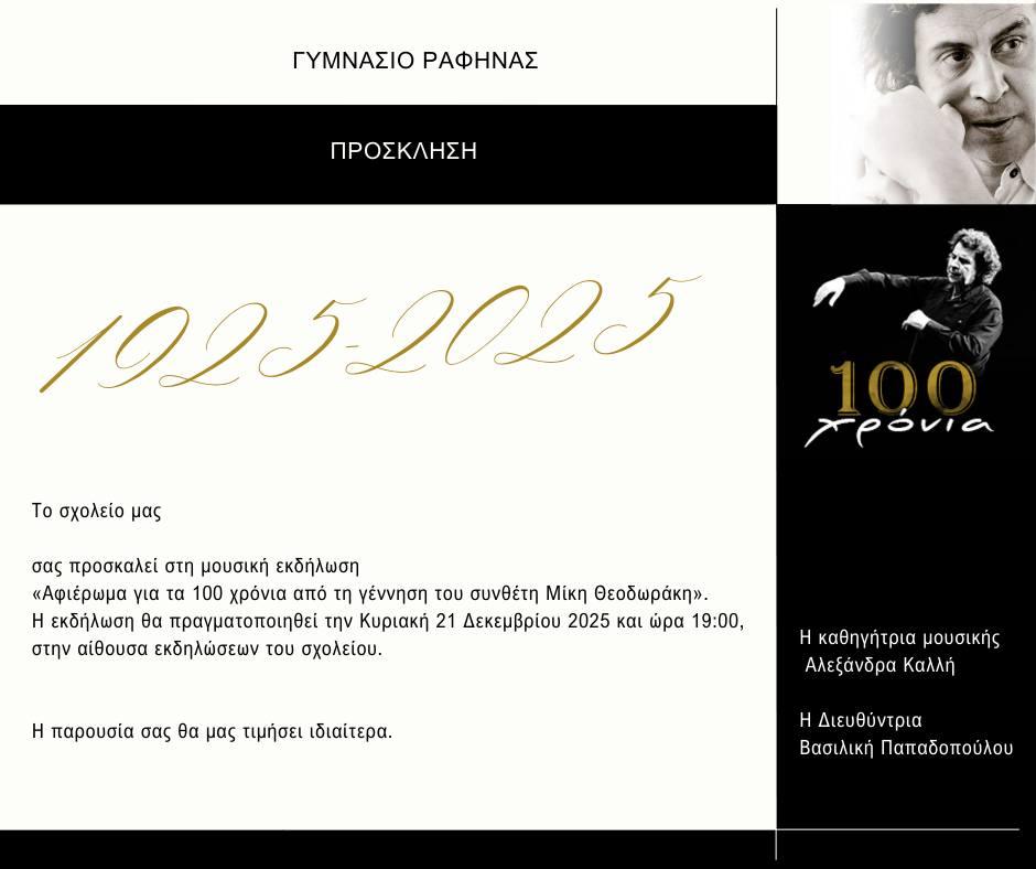 Η εκδήλωση με τίτλο «Αφιέρωμα για τα 100 χρόνια από τη γέννηση του συνθέτη Μίκη Θεοδωράκη» θα πραγματοποιηθεί την Κυριακή 21 Δεκεμβρίου 2025, στις 19:00, στην αίθουσα εκδηλώσεων του σχολείου.