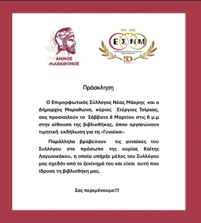 Το Σάββατο 8 Μαρτίου 2025, στις 18:00, ο Δήμαρχος Μαραθώνος, Στέργιος Τσίρκας, και ο Επιμορφωτικός Σύλλογος Νέας Μάκρης (ΕΣΝΜ) διοργανώνουν εκδήλωση αφιερωμένη στην Ημέρα της Γυναίκας. Η εκδήλωση θα πραγματοποιηθεί στη βιβλιοθήκη του Πολιτιστικού & Αθλητικού Πάρκου Νέας Μάκρης και έχει στόχο να τιμήσει τη συμβολή των γυναικών στην κοινωνία.