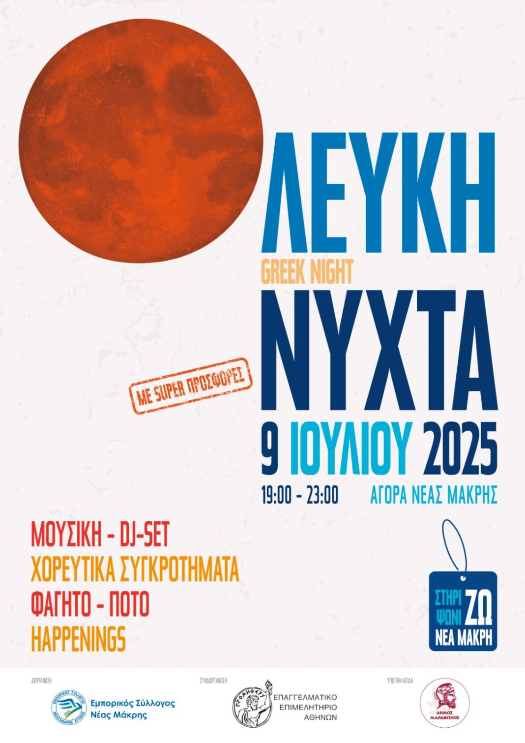 Ο Εμπορικός Σύλλογος Νέας Μάκρης διοργανώνει τη μεγάλη γιορτή της αγοράς: «Λευκή Νύχτα – Greek Night» την Τετάρτη 9 Ιουλίου 2025, από τις 19:00 έως τις 23:00, στην Αγορά Νέας Μάκρης.
