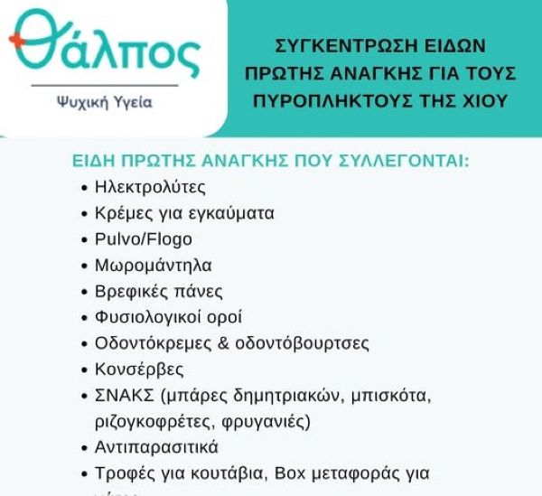 Το Κέντρο Ημέρας & η Κινητή Μονάδα Ενηλίκων «Θάλπος – Ψυχική Υγεία», με βαθιά ενσυναίσθηση απέναντι στους συνανθρώπους μας που δοκιμάζονται, αναλαμβάνει την πρωτοβουλία συλλογής ειδών πρώτης ανάγκης για την ενίσχυση των πληγέντων από τις καταστροφικές πυρκαγιές στη Χίο.