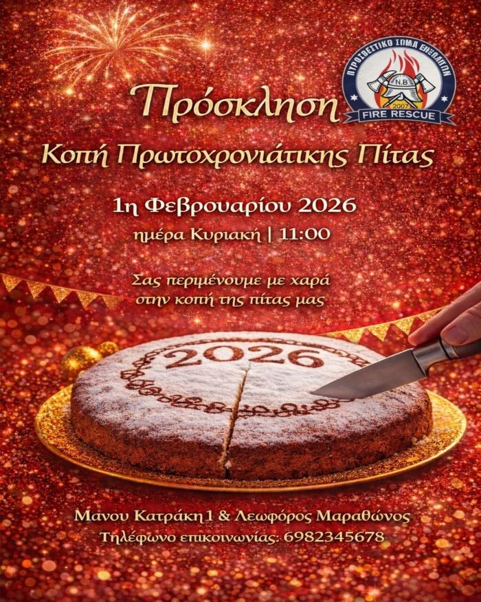 Την Κυριακή 1η Φεβρουαρίου 2026, στις 11:00 το πρωί, κατά την κοπή της πρωτοχρονιάτικης πίτας μας, η οικογένεια του ΠΥ.Σ.ΕΘ. Πυροσβεστικό Σώμα Εθελοντών Προβαλίνθου θα ζήσει μια από εκείνες τις στιγμές που θυμίζουν γιατί ο εθελοντισμός δεν είναι χόμπι, αλλά στάση ζωής.