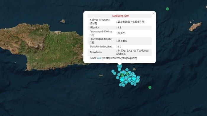 Νέος σεισμός 4,8 Ρίχτερ στην Κρήτη – Συνεχίζεται η σεισμική δραστηριότητα στο Λασίθι