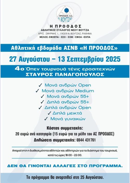 27 Αυγούστου – 13 Σεπτεμβρίου 2025 στον Αθλητικό Σύλλογο Ν. Βουτζά “Η ΠΡΟΟΔΟΣ”, Χρ. Σμύρνης 1, Α’ Είσοδος Ν. Βουτζά Ραφήνας.