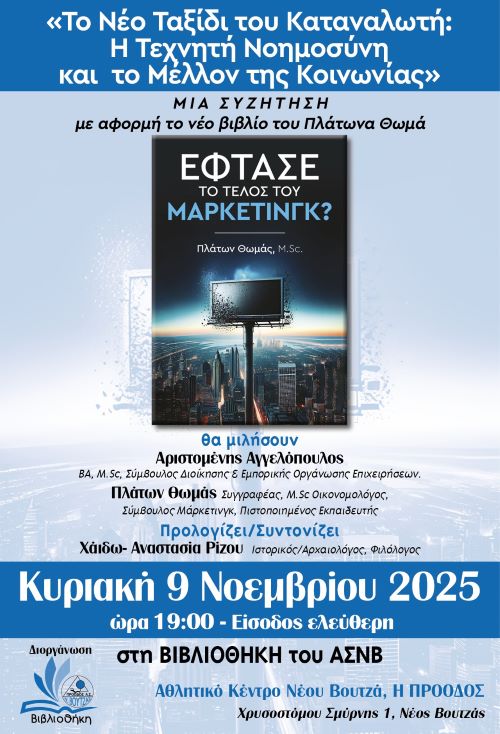 Ο συγγραφέας, M. Sc Οικονομολόγος, Σύμβουλος Μάρκετινγκ & Πιστοποιημένος Εκπαιδευτής, Θωμάς Πλάτων, μετά την επιτυχημένη εκδήλωση της προηγούμενης σαιζόν, επανέρχεται με το νέο του βιβλίο, με τον προκλητικό τίτλο “Έφτασε το Τέλος του Μάρκετινγκ;“.
