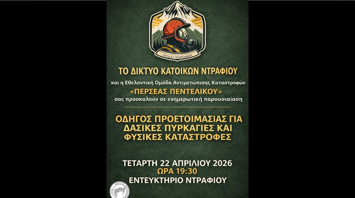 Με αυτό το σκεπτικό, το Δίκτυο Κατοίκων Ντραφίου και η Εθελοντική Ομάδα Αντιμετώπισης Καταστροφών «Περσέας Πεντελικού» διοργανώνουν ενημερωτική παρουσίαση με τίτλο: