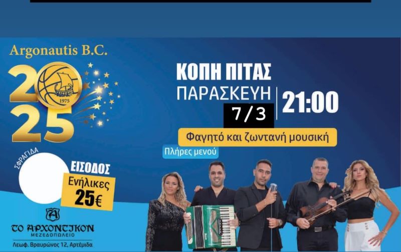 Η ομάδα του Αργοναύτη Ραφήνας διοργανώνει την ετήσια κοπή της βασιλόπιτας την Παρασκευή 7 Μαρτίου, σε μια βραδιά γεμάτη κέφι, φαγητό και ζωντανή μουσική. Η εκδήλωση θα πραγματοποιηθεί στο κέντρο «Αρχοντικό» στην Αρτέμιδα, όπου φίλοι, αθλητές και παράγοντες του συλλόγου θα διασκεδάσουν και θα ανταλλάξουν ευχές για τη νέα χρονιά.
