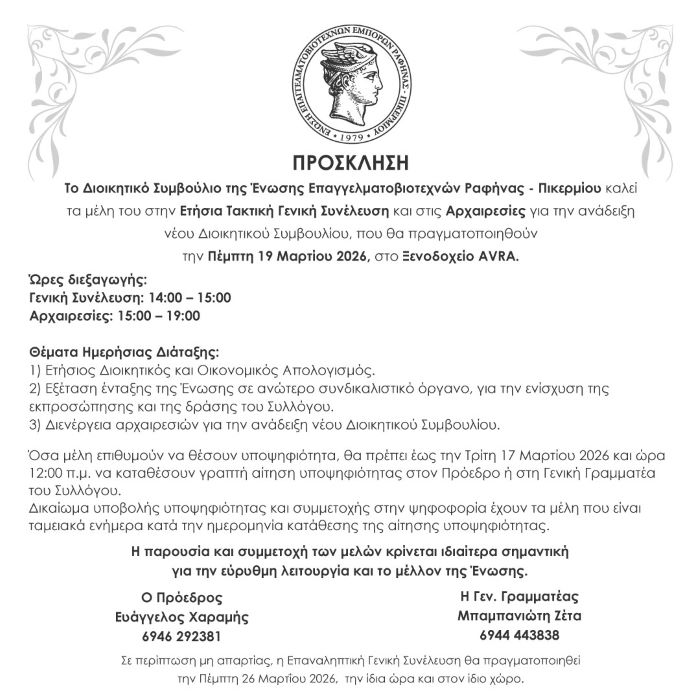 Το Διοικητικό Συμβούλιο της Ένωσης Επαγγελματοβιοτεχνών Ραφήνας – Πικερμίου καλεί τα μέλη του στην Ετήσια Τακτική Γενική Συνέλευση και στις Αρχαιρεσίες για την ανάδειξη νέου Διοικητικού Συμβουλίου, που θα πραγματοποιηθούν την Πέμπτη 19 Μαρτίου 2026, στο Ξενοδοχείο AVRA.