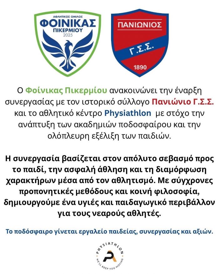 Ο Φοίνικας Πικερμίου ανακοινώνει την έναρξη συνεργασίας με τον ιστορικό σύλλογο Πανιώνιο Γ.Σ.Σ. και το αθλητικό κέντρο Physiathlon με στόχο την ανάπτυξη των ακαδημιών ποδοσφαίρου και την ολόπλευρη εξέλιξη των παιδιών.