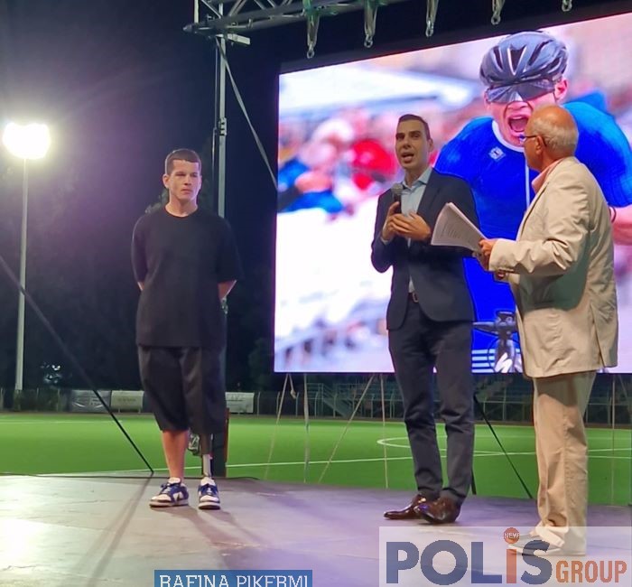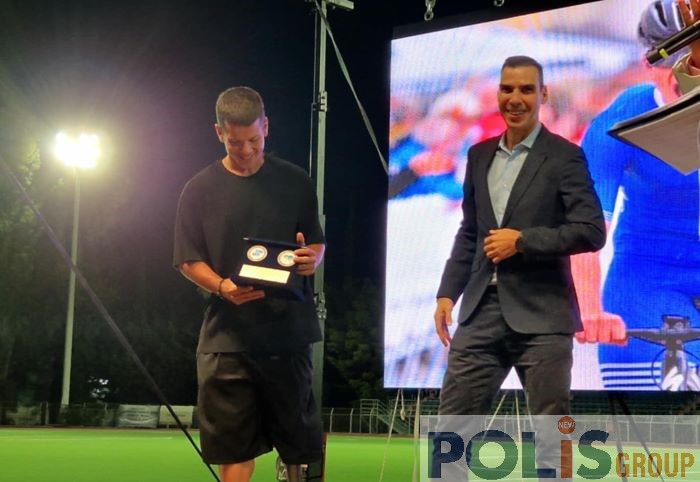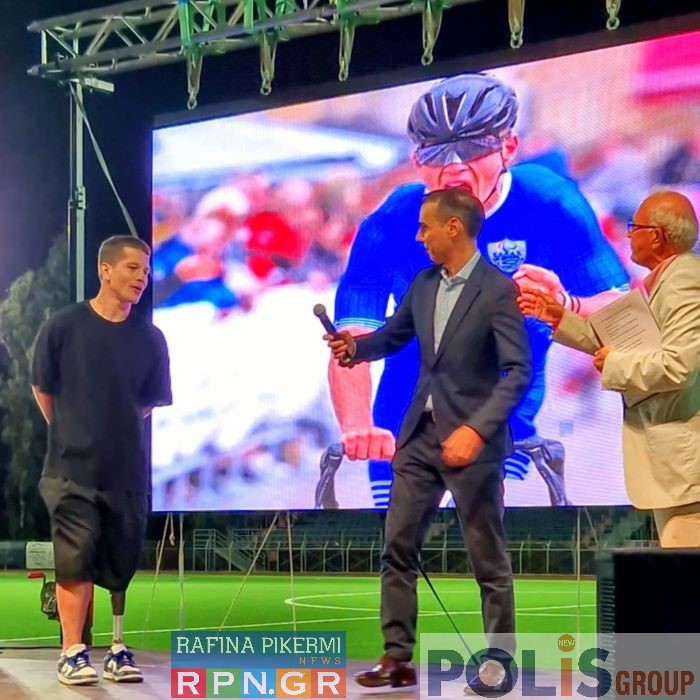 Ο κ. Θεμιστοκλέους ανέβηκε στη σκηνή για να απονείμει βραβείο στον παραολυμπιονίκη της ποδηλασίας Παναγιώτη Παπαγγελή, αναγνωρίζοντας τη σπουδαία του πορεία και το παράδειγμα που δίνει με τη δύναμη ψυχής και την επιμονή του.