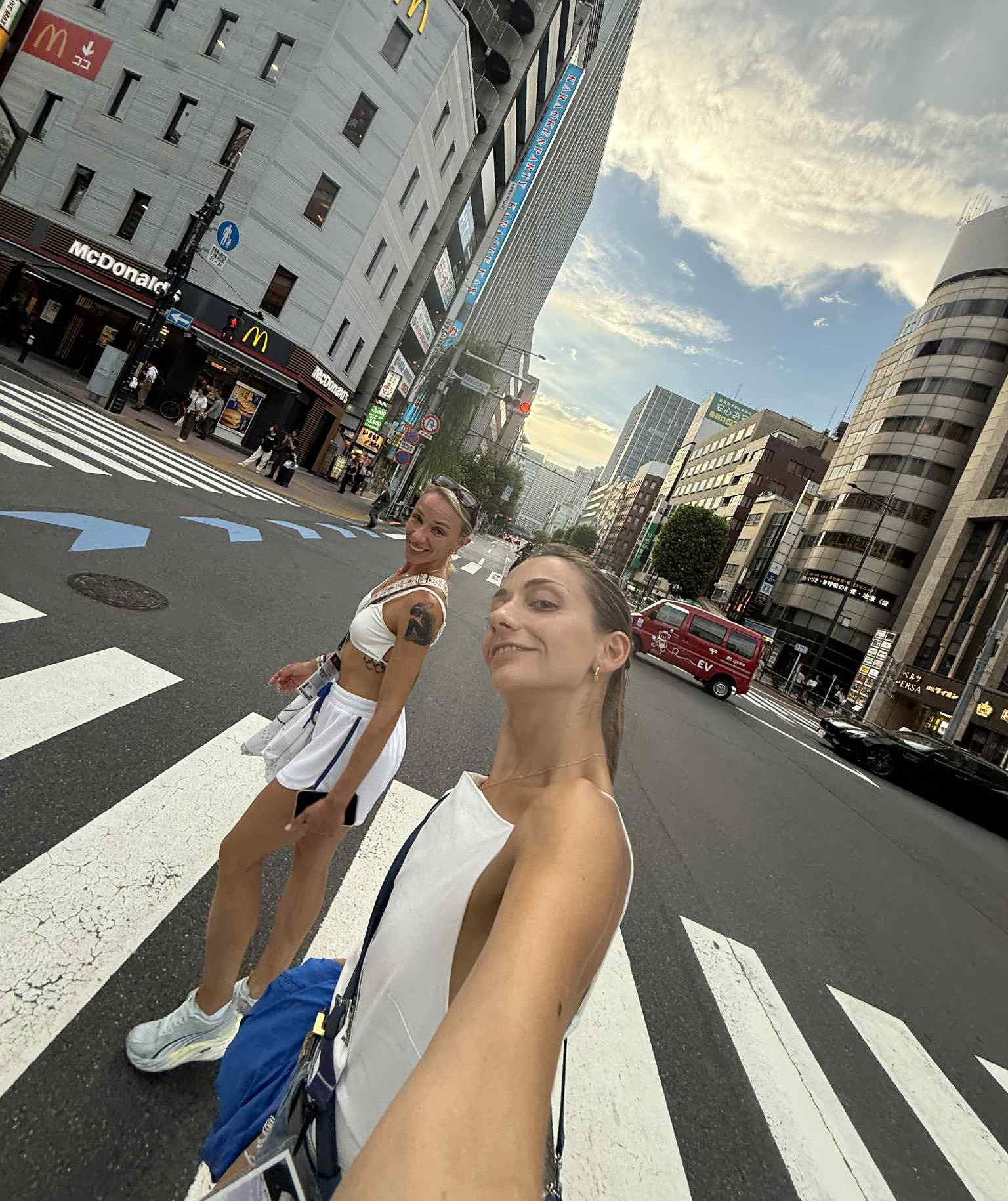 Μετά τον αγώνα των 35 χιλιομέτρων στο Παγκόσμιο Πρωτάθλημα του Τόκιο, η Παγκόσμια Πρωταθλήτρια Αντιγόνη Ντρισμπιώτη και η Βαλκανιονίκης Σοφία Αλικανιώτη περπατούν σαν “άγγελοι” πάνω στη λευκή διάβαση.