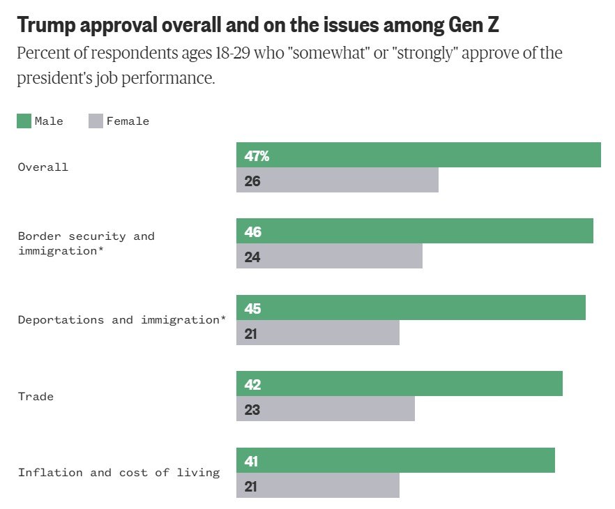 Συνολικά, στην Gen Z το 64% αποδοκιμάζει την απόδοση του Τραμπ έναντι 36% που την εγκρίνει. Ωστόσο, οι νέοι άνδρες εμφανίζονται πιο μοιρασμένοι (53% αποδοκιμάζει, 47% εγκρίνει) σε σχέση με τις νέες γυναίκες (74% αποδοκιμάζει, 26% εγκρίνει). Η διαφορά των 21 ποσοστιαίων μονάδων στην αποδοχή του Τραμπ παραμένει αμετάβλητη από τον Απρίλιο.