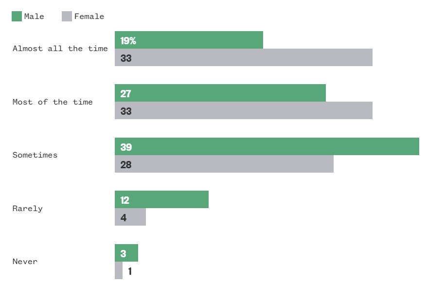 Αυτό το υψηλό επίπεδο άγχους οφείλεται κυρίως στις νέες γυναίκες. Ένα τρίτο των νέων γυναικών δήλωσε ότι νιώθει άγχος «σχεδόν συνεχώς», ενώ ένα ακόμη τρίτο ανέφερε ότι αισθάνεται άγχος «τις περισσότερες φορές». Αντίθετα, λιγότεροι από 2 στους 10 νέους άνδρες της Gen Z δήλωσαν ότι νιώθουν διαρκές άγχος.