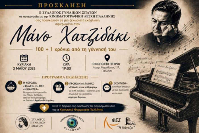 Ο Δήμος Παλλήνης ενημερώνει τους δημότες ότι η «Κινηματογραφική Λέσχη Παλλήνης», ο «Σύλλογος Γυναικών Σπάτων» και ο «ΦΕΣ η Κάντζα» συνδιοργανώνουν μια ξεχωριστή επετειακή εκδήλωση-αφιέρωμα στον σπουδαίο δημιουργό Μάνο Χατζιδάκι, με αφορμή τη συμπλήρωση 100+1 χρόνων από τη γέννησή του.