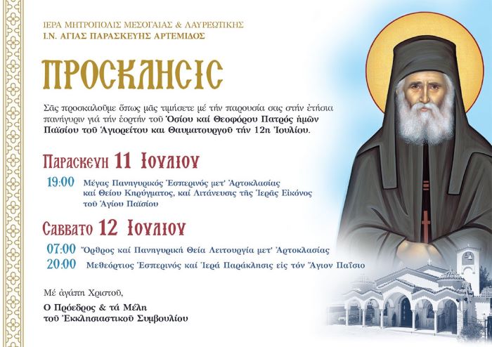 Η ετήσια πανήγυρη για την εορτή του Οσίου και Θεοφόρου Πατρός ημών Παϊσίου του Αγιορείτου και Θαυματουργού στις 12 Ιουλίου θα λάβει χώρα στο παρεκκλήσιο του Αγίου Παϊσίου στον Ιερό Ναό Αγίας Παρασκευής Αρτέμιδος, Χατζηγεωργίου 4.