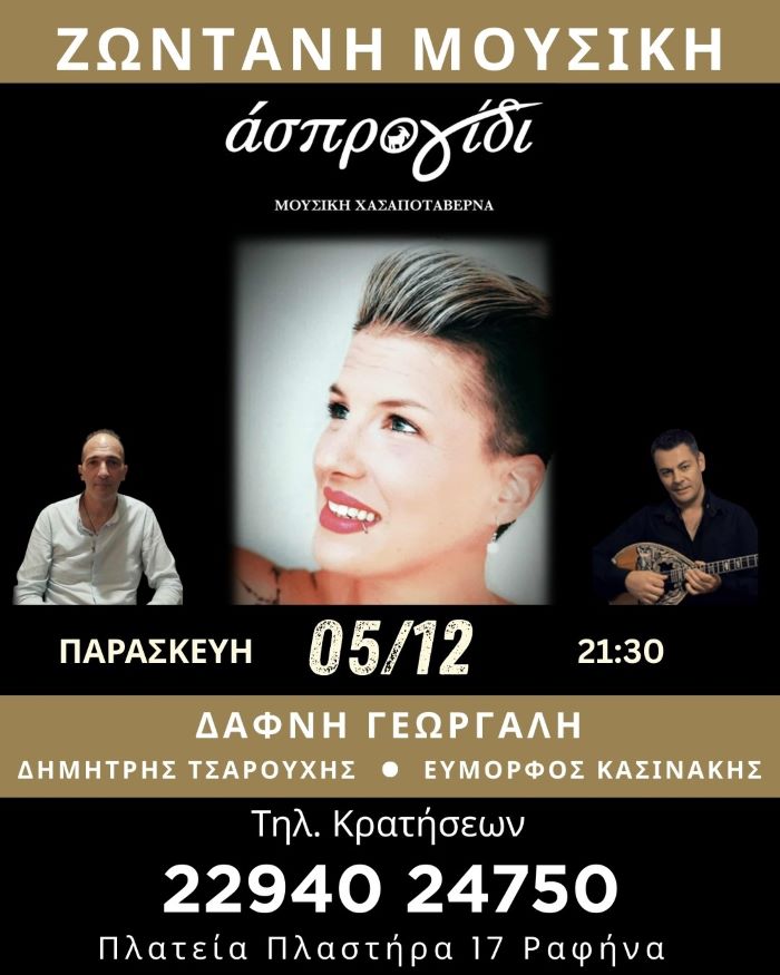 Η Παρασκευή παίρνει… άλλον αέρα στη Ραφήνα! Το Άσπρο Γίδι, το αγαπημένο στέκι της κεντρικής πλατείας, φοράει τα γιορτινά του και υποδέχεται το κοινό με ζωντανή μουσική, ωραίες παρέες και το γνωστό, ζεστό κλίμα που το έχει κάνει σταθερή επιλογή για έξοδο.