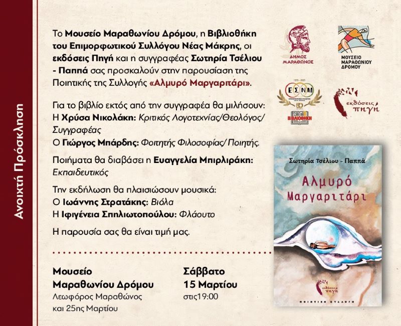 Το Μουσείο Μαραθωνίου Δρόμου, η Βιβλιοθήκη του Επιμορφωτικού Συλλόγου Νέας Μάκρης, οι εκδόσεις «Πηγή» και η συγγραφέας Σωτηρία Τσέλιου – Παππά σας προσκαλούν στην παρουσίαση της Ποιητικής της Συλλογής «Αλμυρό Μαργαριτάρι»