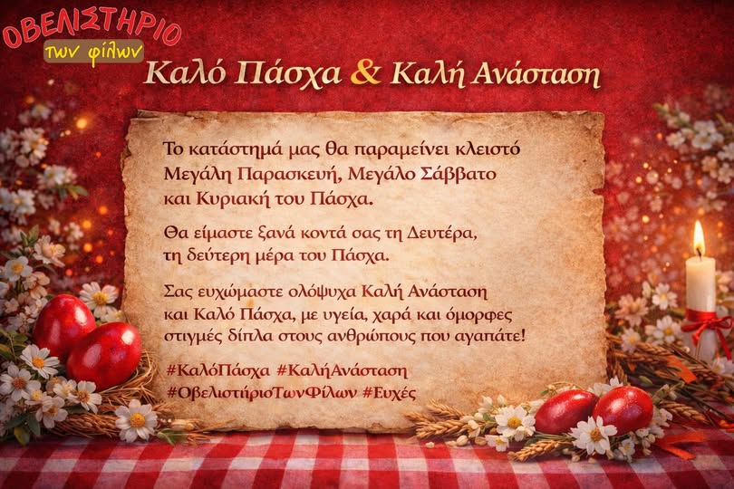 Το «Οβελιστήριο των Φίλων» ενημερώνει το κοινό ότι το κατάστημα θα παραμείνει κλειστό κατά τη διάρκεια των ημερών του Πάσχα, συγκεκριμένα τη Μεγάλη Παρασκευή, το Μεγάλο Σάββατο και την Κυριακή του Πάσχα. Η λειτουργία του θα επανέλθει κανονικά τη Δευτέρα, δεύτερη ημέρα του Πάσχα.