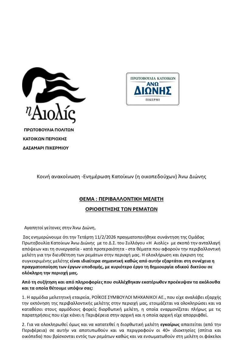 ΡΑΦΗΝΑ - ΠΙΚΕΡΜΙΤΟΠΙΚΑ ΝΕΑΤΟΠΙΚΗ ΚΟΙΝΩΝΙΑ Λιγότερο από 1 λεπταΑνάγνωση Πικέρμι: Εργα και δρόμους στην Ανω Διώνη ζητούν απο τον Δήμο οι κάτοικοι 17 Φεβρουαρίου, 2026 FacebookTwitterPinterestWhatsApp Ακολουθεί επιστολή της Πρωτοβουλίας κατοίκων Άνω Διώνης και της πρωτοβουλίας κατοίκων Δασαμάρι Πικερμίου ”Η Αιολίς” TagsSLIDERΗ ΑΙΟΛΙΣ Αυτή την εβδομάδα ΜΑΡΑΘΩΝΑΣ - ΝΕΑ ΜΑΚΡΗ Νέα Μάκρη: Κολώνα φωτισμού πλάκωσε αυτοκίνητο – Υλικές ζημιές 17 Φεβρουαρίου, 2026 0 Ένα απρόοπτο (;) και πολύ σοβαρό περιστατικό σημειώθηκε το... Life Style -Μόδα Κολωνάκι: Γνωστή τραγουδίστρια «πήρε σβάρνα» 5 αυτοκίνητα με 0,83 αλκοόλ στο αίμα 17 Φεβρουαρίου, 2026 0 Μεθυσμένη τραγουδίστρια σκόρπισε τον τρόμο στο Κολωνάκι – Τρελή... ΠΑΛΛΗΝΗ Κούλουμα 2026 στο Δημοτικό Πάρκο Ανθούσας 17 Φεβρουαρίου, 2026 0 Κούλουμα 2026 στο Δήμο Παλλήνης: Γιορτάζουμε παρέα την Καθαρά... ΖΩΔΙΑ Τα ζώδια σήμερα Τρίτη 17/2 17 Φεβρουαρίου, 2026 0 Αναλυτικές προβλέψεις της ημέρας Κριός: Αγαπητέ Κριέ, η σημερινή... ΚΑΙΡΟΣ Καιρός: Τι ώρα θα βρέξει στην Αττική σήμερα – Δύσκολες οι μεσημεριανές ώρες στην Αθήνα 17 Φεβρουαρίου, 2026 0 Μια κακοκαιρία τύπου express περνά σήμερα πάνω από τη... ΝΕΑ ΜΑΡΑΘΩΝΑΣ - ΝΕΑ ΜΑΚΡΗ Νέα Μάκρη: Κολώνα φωτισμού πλάκωσε αυτοκίνητο – Υλικές ζημιές 0 Ένα απρόοπτο (;) και πολύ σοβαρό περιστατικό σημειώθηκε το... Life Style -Μόδα Κολωνάκι: Γνωστή τραγουδίστρια «πήρε σβάρνα» 5 αυτοκίνητα με 0,83 αλκοόλ στο αίμα 0 Μεθυσμένη τραγουδίστρια σκόρπισε τον τρόμο στο Κολωνάκι – Τρελή... ΠΑΛΛΗΝΗ Κούλουμα 2026 στο Δημοτικό Πάρκο Ανθούσας 0 Κούλουμα 2026 στο Δήμο Παλλήνης: Γιορτάζουμε παρέα την Καθαρά... ΖΩΔΙΑ Τα ζώδια σήμερα Τρίτη 17/2 0 Αναλυτικές προβλέψεις της ημέρας Κριός: Αγαπητέ Κριέ, η σημερινή... ΚΑΙΡΟΣ Καιρός: Τι ώρα θα βρέξει στην Αττική σήμερα – Δύσκολες οι μεσημεριανές ώρες στην Αθήνα 0 Μια κακοκαιρία τύπου express περνά σήμερα πάνω από τη... ΣΠΑΤΑ - ΑΡΤΕΜΙΔΑ Σπάτα: Ο Χρήστος Μαυρίκης ταμπουρώθηκε στο σπίτι του μετά από πυροβολισμούς 0 Σοβαρό επεισόδιο σημειώθηκε στα Σπάτα, με πρωταγωνιστή τον Χρήστο... ΠΑΛΛΗΝΗ Επιμορφωτικό σεμινάριο για τους υπαλλήλους του δήμου Παλλήνης 0 Επιτυχώς και με ουσιαστικά αποτελέσματα πραγματοποιήθηκε το πρώτο επιμορφωτικό... ΕΙΔΗΣΕΙΣ Πέθανε η Ελένη Γλύκατζη – Αρβελέρ – Πρώτη γυναίκα Πρύτανης της Σορβόννης 0 Έφυγε από τη ζωή, σε ηλικία 99 ετών, η... RPN.GR Νέα Μάκρη: Κολώνα φωτισμού πλάκωσε αυτοκίνητο – Υλικές ζημιές ΜΑΡΑΘΩΝΑΣ - ΝΕΑ ΜΑΚΡΗ 17 Φεβρουαρίου, 2026 Σπάτα: Ο Χρήστος Μαυρίκης ταμπουρώθηκε στο σπίτι του μετά από πυροβολισμούς ΣΠΑΤΑ - ΑΡΤΕΜΙΔΑ 16 Φεβρουαρίου, 2026 Νέος Βουτζάς: Κυκλοφοριακές ρυθμίσεις επί της Λ. Μαραθώνος από Τρίτη 24/2/2026, λόγω εργασιών της ΕΥΔΑΠ ΜΑΡΑΘΩΝΑΣ - ΝΕΑ ΜΑΚΡΗ 16 Φεβρουαρίου, 2026 Συνεδριάζει η Δημοτική Επιτροπή Ραφήνας Πικερμίου την Τρίτη 17 Φεβρουαρίου ΡΑΦΗΝΑ - ΠΙΚΕΡΜΙ 16 Φεβρουαρίου, 2026 Ραφήνα–Πικέρμι: Πιλοτική έναρξη λειτουργίας φωτοσήμανσης στις «έξυπνες διαβάσεις» – Αποκατάσταση του χρωματισμού οδοσήμανσης ΡΑΦΗΝΑ - ΠΙΚΕΡΜΙ 16 Φεβρουαρίου, 2026 ΕΙΔΗΣΕΙΣΡΑΦΗΝΑ - ΠΙΚΕΡΜΙΑΘΛΗΤΙΚΑΜΑΡΑΘΩΝΑΣ - ΝΕΑ ΜΑΚΡΗΕΚΔΗΛΩΣΕΙΣΤΟΠΙΚΗ ΚΟΙΝΩΝΙΑΔΙΑΦΟΡΑ Προηγούμενο άρθροΣπάτα: Ο Χρήστος Μαυρίκης ταμπουρώθηκε στο σπίτι του μετά από πυροβολισμούςΕπόμενο άρθροΚαιρός: Τι ώρα θα βρέξει στην Αττική σήμερα – Δύσκολες οι μεσημεριανές ώρες στην Αθήνα