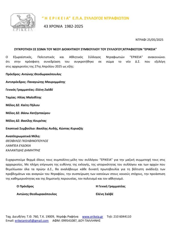 0 Εξωραϊστικός, Πολιτιστικός και Αθλητικός Σύλλογος Ντραφιωτιών “ΕΡΙΚΕΙΑ” ανακοινώνει ότι στην πρόσφατη συνεδρίαση του συγκροτήθηκε σε σώμα το νέο Δ.Σ. που εξελέγη στις αρχαιρεσίες της 27ης Απριλίου 2025 ως εξής: