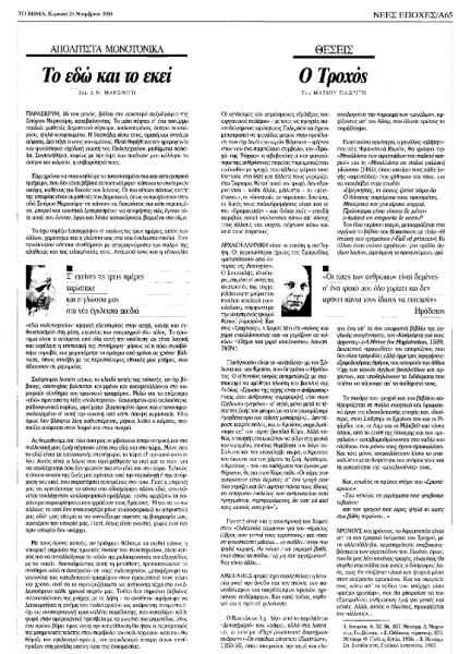 *Κείμενο του Δ. Ν. Μαρωνίτη, που έφερε τον τίτλο «Το εδώ και το εκεί» και είχε δημοσιευτεί στην εφημερίδα «Το Βήμα» την Κυριακή 25 Νοεμβρίου 2001.