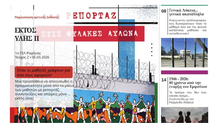 Στην ενότητα “Κοινωνία” οι μαθήτριες Anastasia Smargianaki, Apostolia Papadopoulou και Ηρώ Πάντζου υπογράφουν το κεντρικό άρθρο του φύλλου, ένα άρθρο για το Ειδικό Σχολείο των Φυλακών Αυλώναν και το ρεπορτάζ τους εκεί. Οι μαθήτριες αποτυπώνουν με γλαφυρότητα την εμπειρία τους στον χώρο των φυλακών και τη συνομιλία τους με τους ανήλικους κρατούμενους. Διαβάζοντας κανείς το άρθρο τους ακούει τις φωνές αυτών των παιδιών, παιδιών “ενός κατώτερου Θεού” ομολογουμένως, να περιγράφουν τη ζοφερή πραγματικότητα την οποία βιώνουν πίσω από τα κάγκελα της φυλακής αλλά και το πώς το σχολείο “φωτίζει” τις ζωές τους. Το αμέσως επόμενο άρθρο είναι αφιερωμένο σε ό,τι ονομάζουμε “συλλογική μνήμη”. Με αφορμή τα 80 χρόνια από την έναρξη του Ελληνικού Εμφυλίου, η Χριστίνα η Δρόσου στο άρθρο της “1946-2026″: Το τραύμα που δεν έχε κλείσει ακόμα” εκφράζει εύλογους προβληματισμούς ενός νέου ανθρώπου απέναντι στο χτες αλλά και στον τρόπο που ένα τόσο ιδιαίτερο κεφάλαιο της Ιστορίας διδάσκεται στα σχολεία. Στη συνέντευξη που της παραχωρεί ο διακεκριμένος ιστορικός Raymondos Alvanos Ραϋμόνδος Αλβανός ζητά απαντήσεις σε όλα όσα την απασχολούν εκπροσωπώντας κάθε σκεπτόμενο νέο και νέα της εποχής της. Στην ίδια ενότητα η Εύη Αναστασιάδη με την ιδιαίτερη πένα της “σφάζει με το βαμβάκι” την ελληνική καθεστηκυια τάξη στο άρθρο της “Η Ελλάδα της Διαφθοράς: Επικαλούμενοι το δικαίωμα της…φωνής”, oι Τουντορεάνου Ντόινα -Κωνσταντίνα Σαμάνη αγγίζοντας το ευαίσθητο θέμα της Διαταραχής Αυτιστικού Φάσματος διερευνούν τον τρόπο που η Γλώσσα αναπαράγει στερεότυπα και η εκκολαπτόμενη δημοσιογράφος Nεφέλη Ιωαννίδη κλείνει το μάτι στον “απολιτικ” θεσμό της Eurovision!