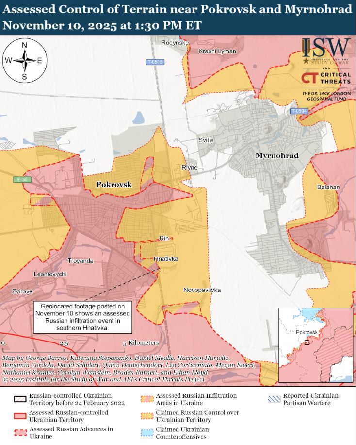«Η κατάσταση στην περιοχή Pokrovsk–Myrnohrad παραμένει δύσκολη, καθώς οι ουκρανικές δυνάμεις μάχονται για να κρατήσουν τις πλευρές του θύλακα και οι ρωσικές δυνάμεις συνεχίζουν να προελαύνουν στην περιοχή» αναφέρει στην πρόσφατη έκθεσή του. Μπορεί οι ουκρανικές δυνάμεις να αντεπιτίθενται εντός του Ποκρόβσκ και στα δυτικά του περίχωρα, ώστε να αποτρέψουν περαιτέρω ρωσικές προελάσεις στη νότια πλευρά του θύλακα, ωστόσο, όπως σημειώνει το Ινστιτούτο ότι οι Ρώσοι συνεχίζουν να προελαύνουν στο ανατολικό και νότιο Pokrovsk.
