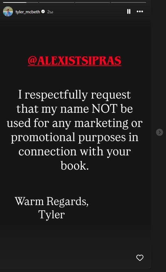 Με ένα story στο Instagram, ο Τάιλερ Μακμπέθ ταγκάροντας τον Αλέξη Τσίπρα αναφέρει: «Ζητώ με σεβασμό, το όνομά μου να ΜΗ χρησιμοποιείται για οποιονδήποτε σκοπό σκοπό διαφήμισης ή προώθησης σε σχέση με το βιβλίο σας».