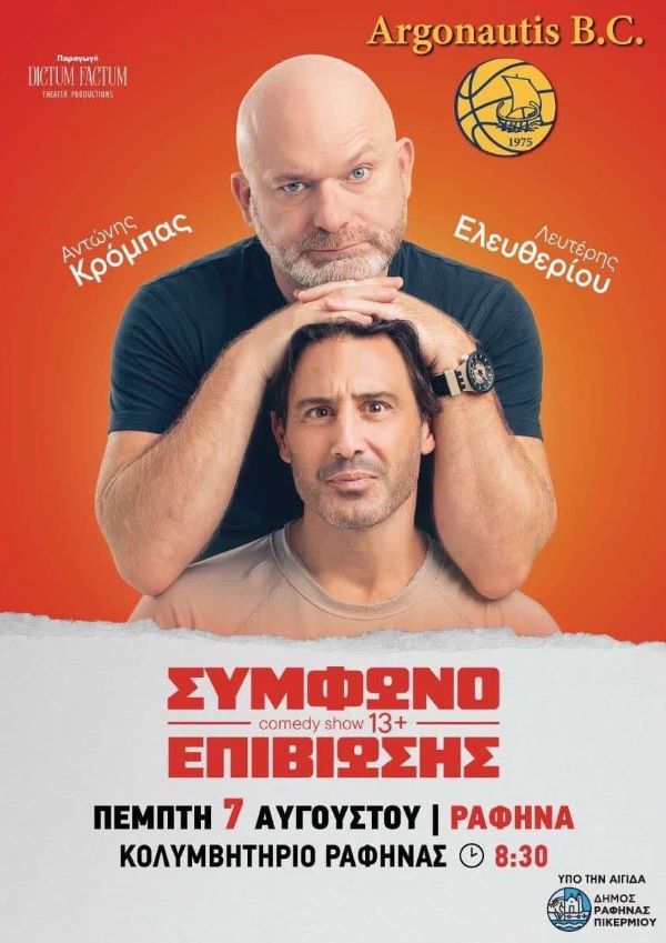 Ραφήνα ”Αργοναύτης”: Παράσταση «Σύμφωνο Επιβίωσης» με Κρόμπα & Ελευθερίου – Πέμπτη 7 Αυγούστου στο Κολυμβητήριο!
