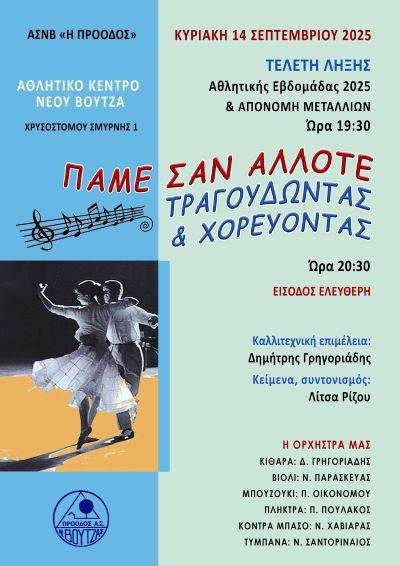 Πιστοί στο ραντεβού μας κάθε Σεπτέμβρη, φτάσαμε και φέτος στο τέλος της ΑΘΛΗΤΙΚΗΣ ΕΒΔΟΜΑΔΑΣ του Συλλόγου μας, με την καθιερωμένη τελετή Λήξης κα την ΑΠΟΝΟΜΗ ΜΕΤΑΛΛΙΩΝ στους αθλητές μας και τους αθλούμενους στα διάφορα τμήματά μας. Και όπως πάντα η βραδιά θα κλείσει με τη μουσική μας εκδήλωση, που ετοίμασε για μας ο άοκνος συμπολίτης και μέλος του Συλλόγου, ο μουσικός, Δημήτρης Γρηγοριάδης, με τους συνεργάτες του, που θα μας ταξιδέψει σε εποχές αλλοτινές, ρομαντικές, πιο ανθρώπινες, με μελωδίες που υμνούν τον έρωτα , την αγάπη, τον καημό του αποχωρισμού, τη γλυκιά νοσταλγία και αναδεικνύουν την ουσία και την ομορφιά των πραγμάτων.