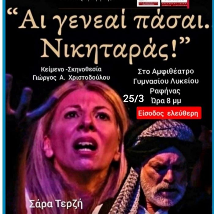 Ο Δήμος Ραφήνας-Πικερμίου σας προσκαλεί την Τρίτη 25 Μαρτίου 2025, στις 20:00, στο Αμφιθέατρο Γυμνασίου-Λυκείου Ραφήνας, στην ξεχωριστή θεατρική παράσταση «Αι γενεαί πάσαι… Νικηταράς!», ένα έργο του Γιώργου Α. Χριστοδούλου.