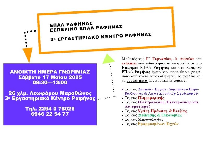 Μαθητές της Γ΄ Γυμνασίου, Α Λυκείου και ενήλικες που ενδιαφέρονται να φοιτήσουν στο Ημερήσιο ΕΠΑΛ Ραφήνας και στο Εσπερινό ΕΠΑΛ Ραφήνας έχουν την ευκαιρία να γνωρίσουν από κοντά τους καθηγητές, το σχολείο και τα εργαστήρια των παρακάτω τομέων:
