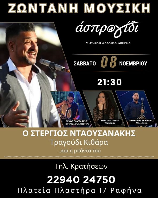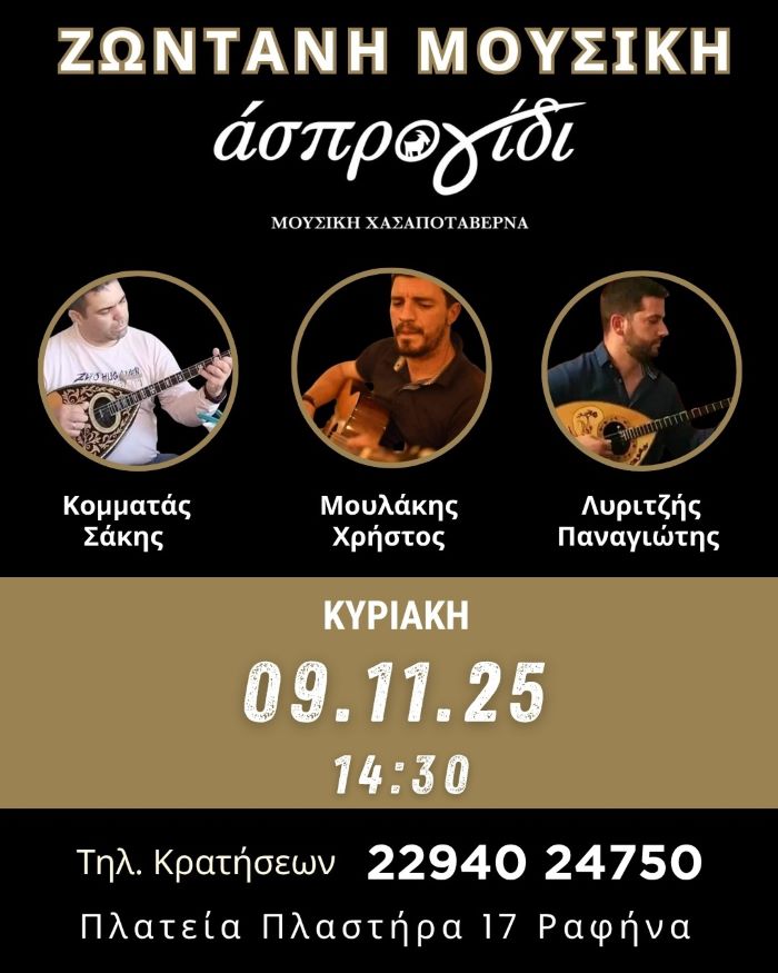 Το “Άσπρο Γίδι” σας περιμένει με ζωντανή μουσική, καλό φαγητό και ατμόσφαιρα που θυμίζει τις Κυριακές στο χωριό – παρέα, κρασί και τραγούδια.