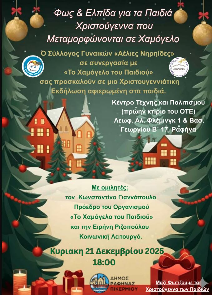 Η εκδήλωση θα πραγματοποιηθεί την Κυριακή 21 Δεκεμβρίου 2025, στις 18:00, στο Κέντρο Τέχνης & Πολιτισμού Ραφήνας, με στόχο τη στήριξη παιδιών και οικογενειών που βρίσκονται σε ανάγκη.