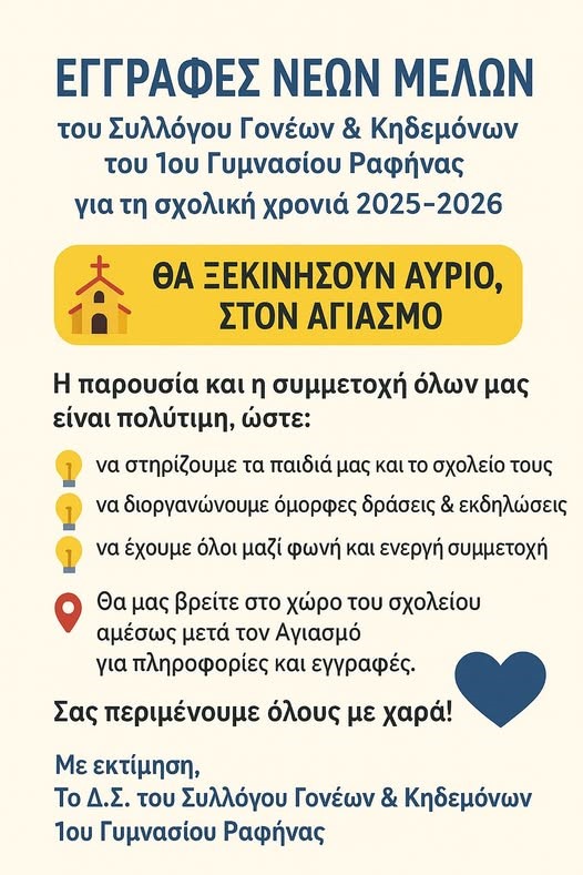Ο Σύλλογος Γονέων & Κηδεμόνων του 1ου Γυμνασίου Ραφήνας ανοίγει τις εγγραφές νέων μελών για τη σχολική χρονιά 2025-2026. Η διαδικασία θα ξεκινήσει αύριο, αμέσως μετά τον Αγιασμό, στον χώρο του σχολείου.