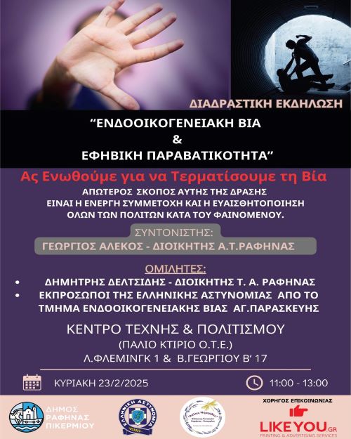 διαδραστική εκδήλωση με θέμα: «Ενδοοικογενειακή βία και εφηβική παραβατικότητα». Η εκδήλωση θα πραγματοποιηθεί στο Κέντρο Τέχνης και Πολιτισμού (πρώην κτίριο του ΟΤΕ) την Κυριακή 23 Φεβρουαρίου 2025 και ώρα 11.00 – 13.00. Συντονιστής της εκδήλωσης θα είναι ο κύριος Αλέκος Γεώργιος, Διοικητής του Αστυνομικού Τμήματος Ραφήνας Πικερμίου με εμπειρία στα θέματα ενδοοικογενειακής βίας. Ομιλητές θα είναι ο κύριος Δημήτριος Δελτσίδης , Διοικητής του Τμήματος Δίωξης και Εξειχνίασης Εγκλημάτων Ραφήνας Πικερμίου και εκπρόσωποι της ΕΛ.ΑΣ από το Γραφείο Ενδοοικογενειακής Βίας Αγ. Παρασκευής καθώς και