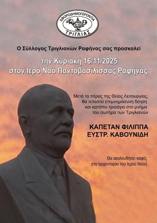 Ο Σύλλογος Τριγλιανών Ραφήνας τιμά για ακόμη μία χρονιά τον σωτήρα των Τριγλιανών, Καπετάν Φιλίππα Καβουνίδη, με εκδήλωση μνήμης και ευγνωμοσύνης που θα πραγματοποιηθεί την Κυριακή 16 Νοεμβρίου 2025 στον Ιερό Ναό της Παντοβασίλισσας Ραφήνας.