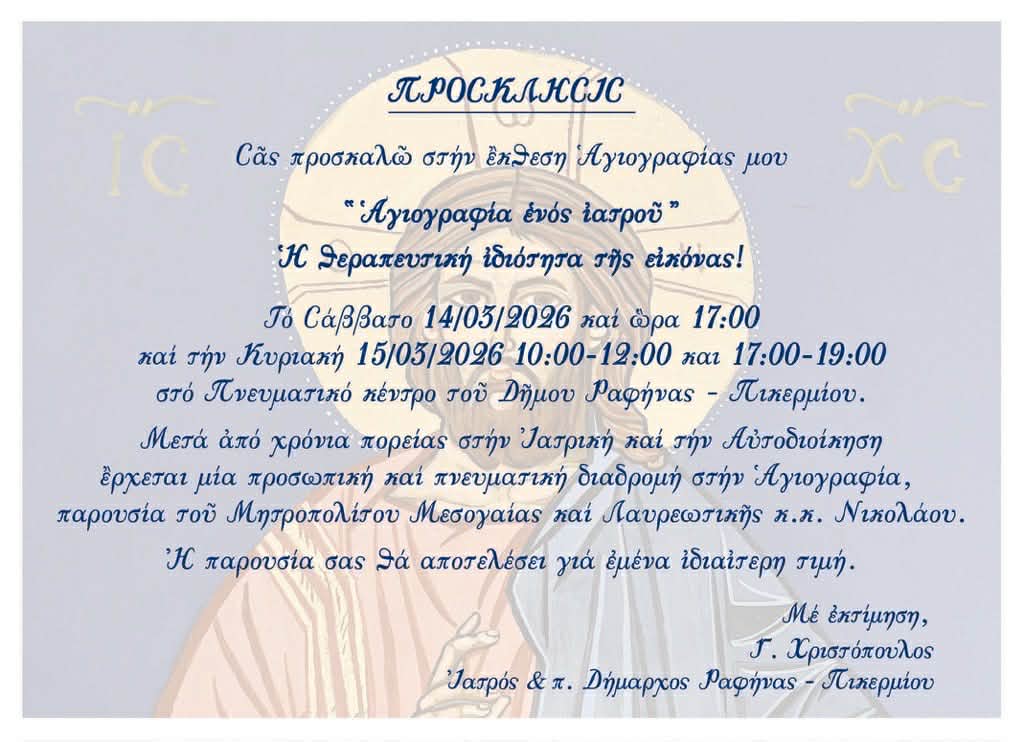 Το Τμήμα Πολιτισμού του Δήμου Ραφήνας Πικερμίου σας καλεί στα εγκαίνια της Έκθεσης Αγιογραφίας με τίτλο: